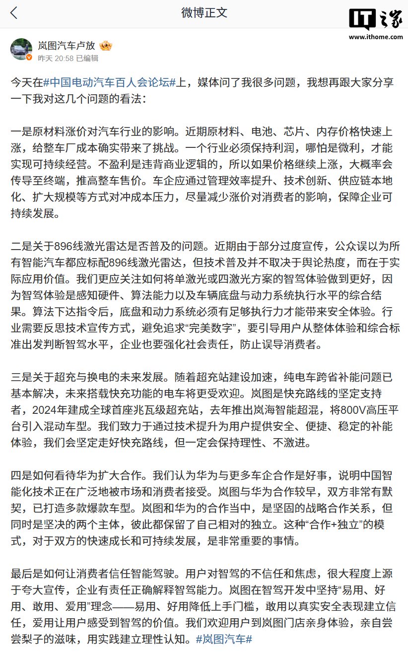 岚图汽车卢放回应“如何看待华为扩大合作”,称说明中国智能化技术正在广泛地被市场和消费者接受